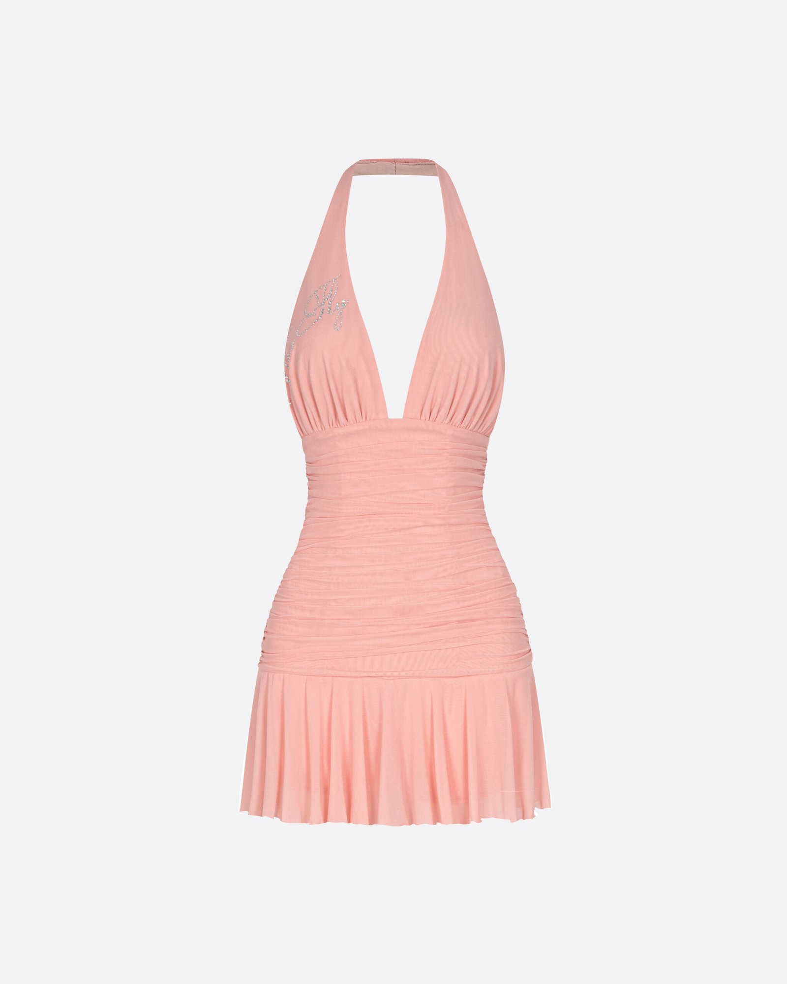 • Halter neckline with ruched body